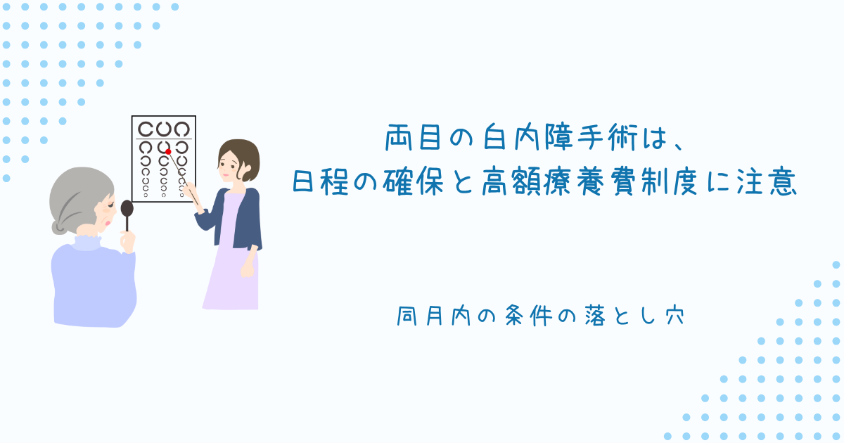 特に両目を手術すると、2回手術が必要ですが、この2回が、月をまたいで手術すると、高額療養費制度は、適用されません。