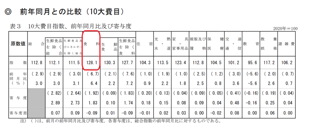 この発表によると物価上昇率は総合指数で 前年同月比3.0%の上昇 と発表されました。2020年に比べると112.8です。 1.13倍の上昇です。