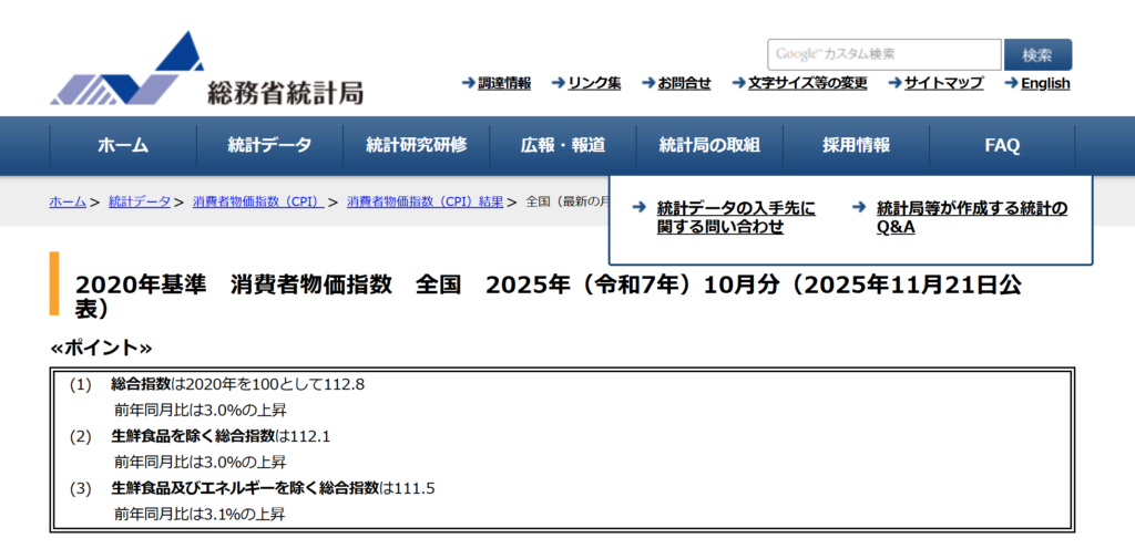 総務省統計局が毎月CPI(消費者物価指数)を発表してます。これを見ると物価がどれくらい上昇しているのかわかります。
