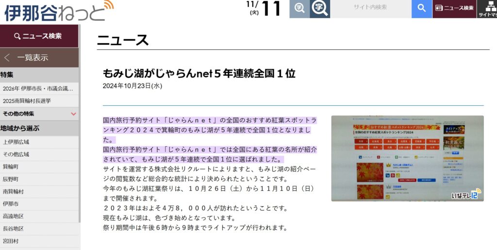 箕輪町のもみじは、じゃらんネットで5年連続日本一を獲得したようです。