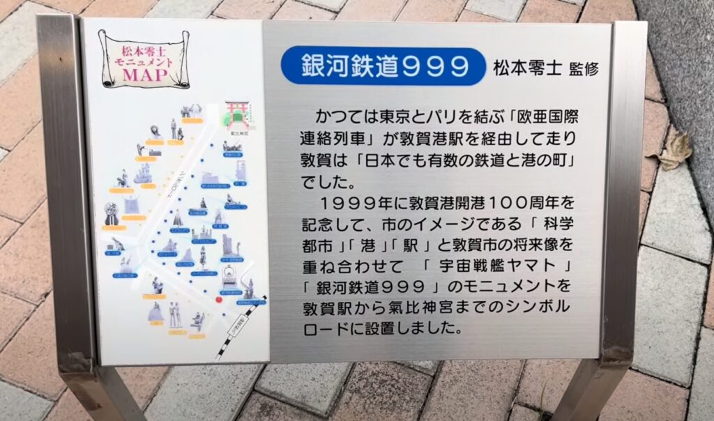 1999年に敦賀開港100周年を記念して、市のイメージである「科学都市」「港」「駅」と敦賀市の将来像を重ね合わせて「宇宙戦艦ヤマト」「銀河鉄道999」のモニュメントを敦賀駅から気比神宮までのシンボルロードの設置しました。(松本零士さんは敦賀出身ではないそうです。)